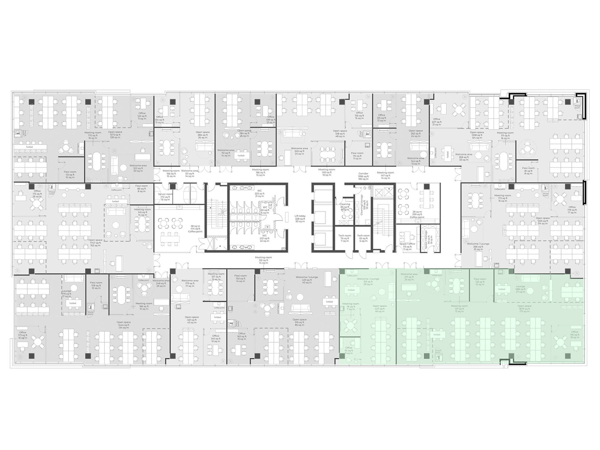 - Coworking area: a spacious 24,219 sq ft coworking zone with contemporary furniture and bright interiors, fostering productivity.